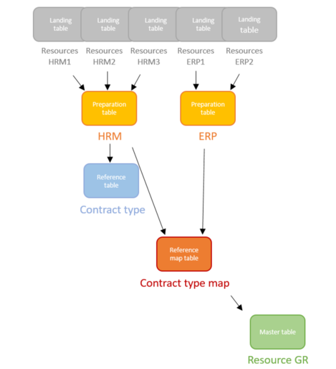 Data of similar source system types are merged into the preparation layer (step 2). Whether 1, 2 or more ERPs are connected to the MDM, the resource data of each of them will be funneled into 1 single ERP resource preparation table. By doing so, only the landing layer is impacted when new systems are plugged to the MDM solution. All the layers downstream remain untouched!