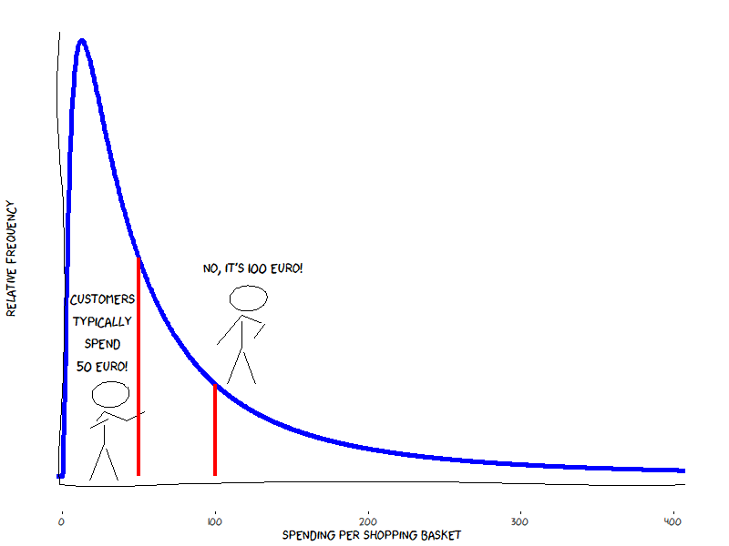You’re also responsible for the reporting regarding the sales of the previously mentioned web shop, and you ask two employees to tell you how much a customer is typically spending when they buy from your site. One of these employees will tell you it’s fifty euro while the other one insists it’s one hundred. You’re used to some irregularities in preciseness of those reporting to you, but this is outrageous. On closer inspection however it turns out both might be right; what we’re dealing with is a very typical case of median versus mean.