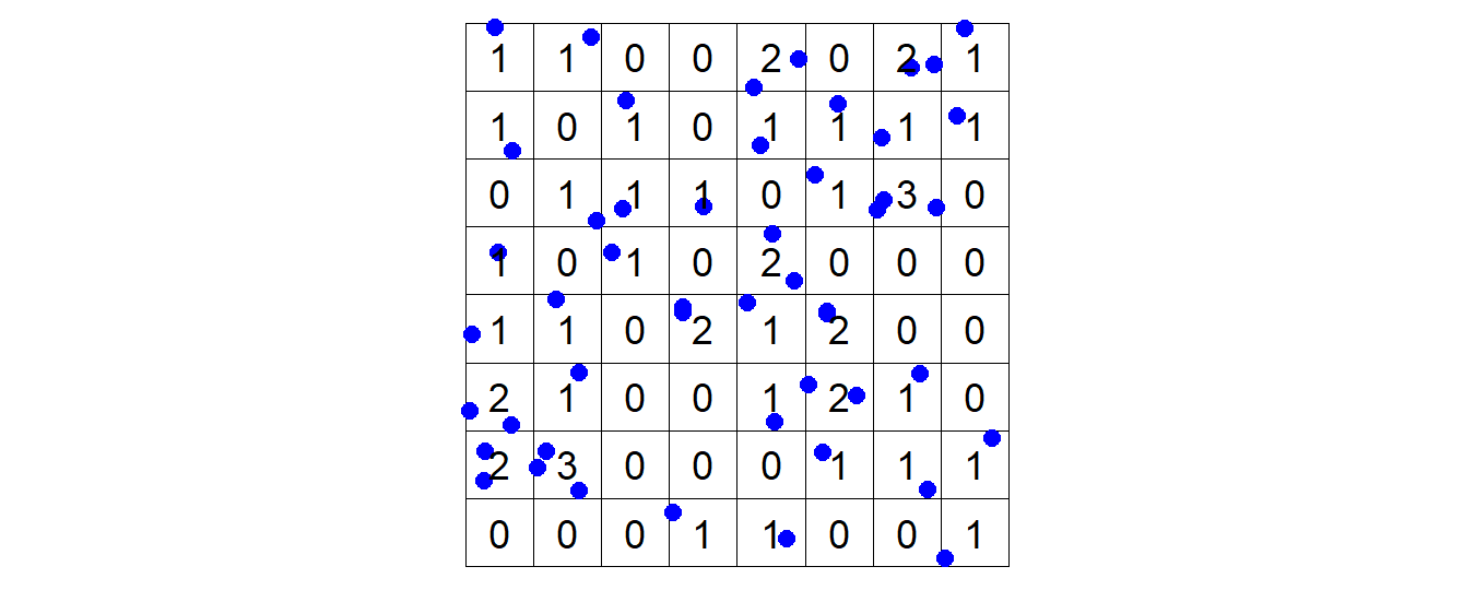 Figure 1: Blue dots represent bombs, and the numbers in each cell are the number of bombs in that cell. This is only 1/9th of of how Clarke’s original grid must have looked. People also tend to see patterns due to so called spurious relationships. Here we do actually have a statistically significant relationship between two variables however there is still no direct causal relationship in either direction. A well known example of this is the positive relationship between the amount of ice cream sold and the number of deaths by drowning. Eating ice cream does not increase anybody’s probability of drowning, so it’s not the cause, nor is ice cream typically eaten at funerals of drowning victims, so it isn’t the result either. The reason for this relationship is or course the fact that both drowning and eating ice cream are much more common with warm weather.