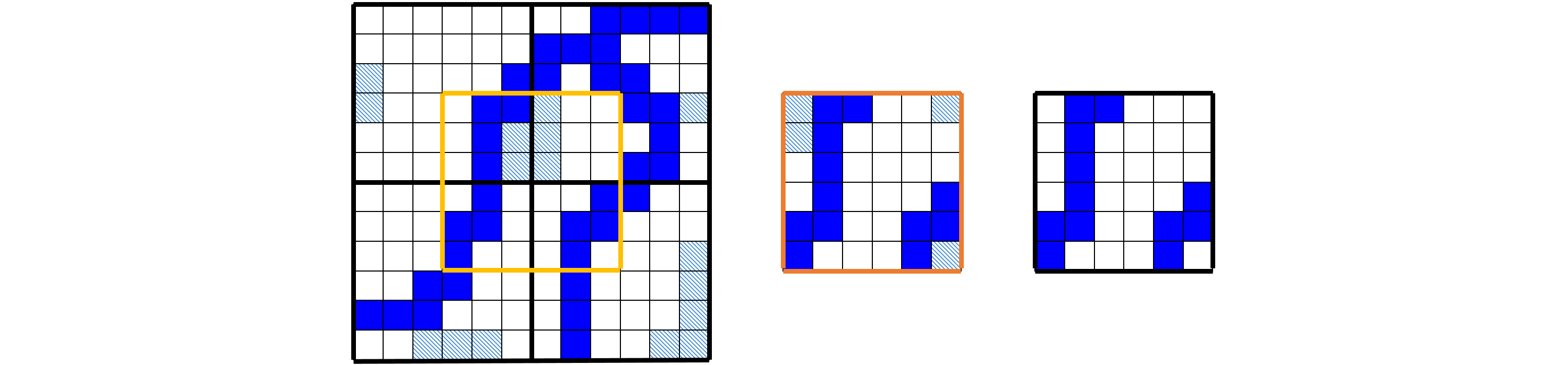 Figure 2: Left: 2 by 2 predictions. Full blue pixels are correct predictions, hatched blue ones on the edges are false positives. The middle image is a shifted prediction corresponding with the area marked by the orange square in the left image. The right shows the result where only pixels predicted by both unshifted and shifted were kept.