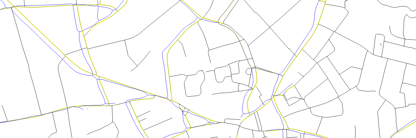 At this point we had vectors that very well represented the roads on the old maps. To compare with the current situation of roads in Flanders we even had to a bit further: Even when a road was present both in the past as it is now the vectors would never align exactly due to inaccuracies on the old maps or because the middle of a road would be located slightly differently over all these years. The following image illustrates this with the vectors contained from the 1904 map in blue and the current roads (black). Most roads that were present back then still exist, but a lot of roads have been added: