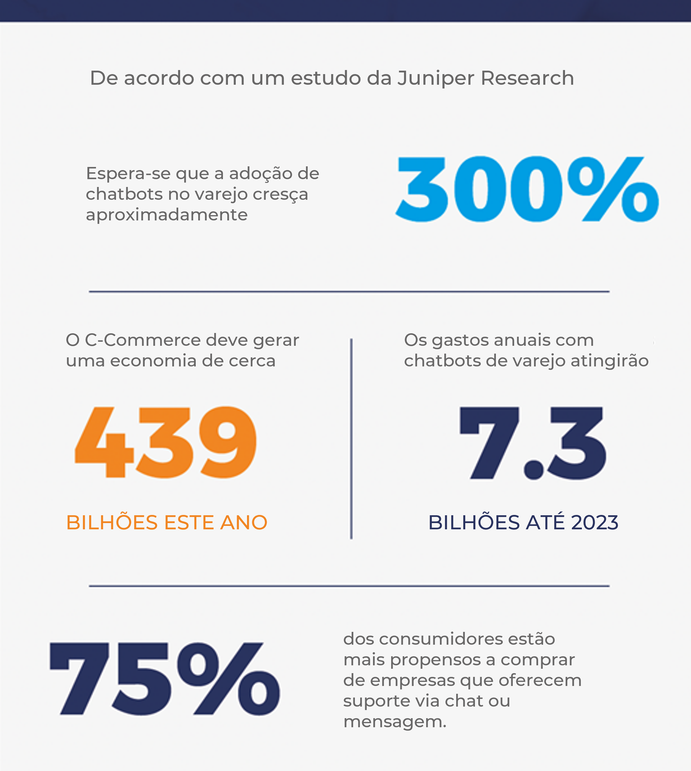 O mercado de Conversational Commerce é relativamente novo e está em constante evolução, com mais e mais empresas adotando essa tecnologia a cada dia. No entanto, de acordo com um estudo da Juniper Research, espera-se que a adoção de chatbots no varejo cresça aproximadamente 300%, atingindo um gasto anual de U$ 7,3 bilhões, o que indica um grande potencial para a adoção desse tipo de plataforma em vários setores.