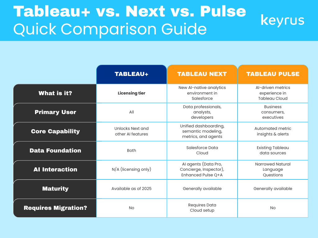 TL;DR Tableau+ is the licensing tier that unlocks access to newer AI-powered capabilities; Tableau Pulse is an intelligent metrics and insights experience built for business consumers; and Tableau Next is an entirely new, AI-native analytics environment built on Salesforce's Data Cloud and Agentforce platform.