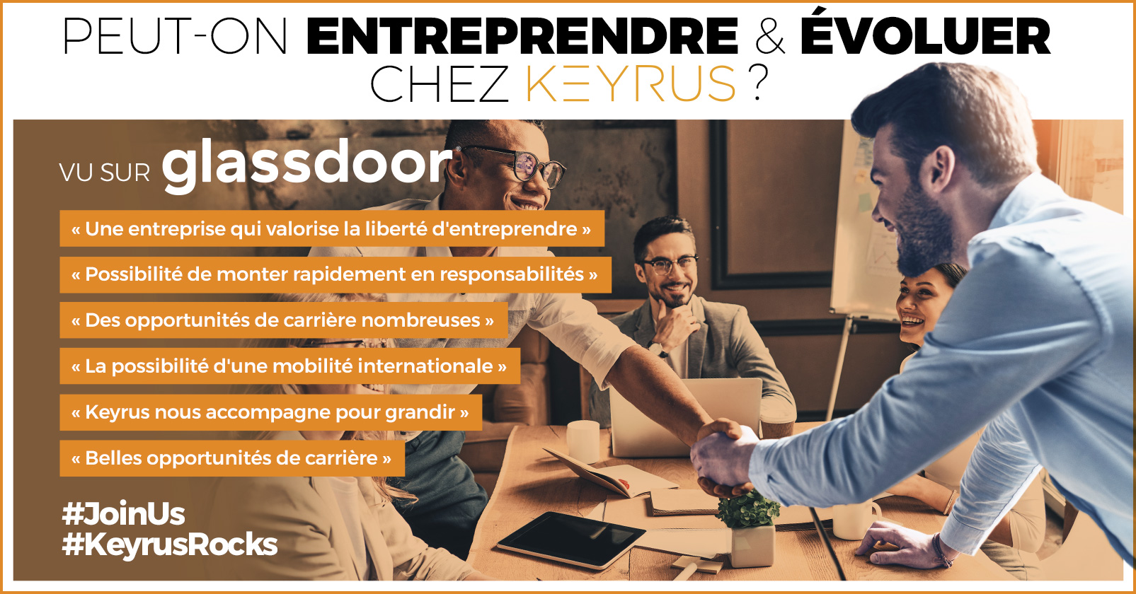 Peut-on entreprendre & évoluer chez Keyrus ? « Une entreprise qui valorise la liberté d'entreprendre » « Possibilité de monter rapidement en responsabilités » « Des opportunités de carrière nombreuses » « La possibilité d'une mobilité internationale » « Keyrus nous accompagne pour grandir » « Belles opportunités de carrière »