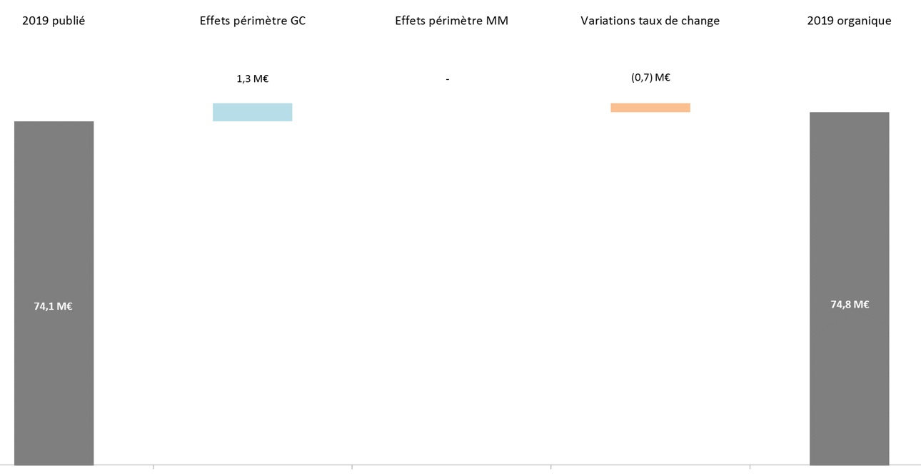 En 2020, les retraitements permettant de passer du chiffre d’affaires 2019 publié au chiffre d’affaires 2019 organique se présentent comme suit :