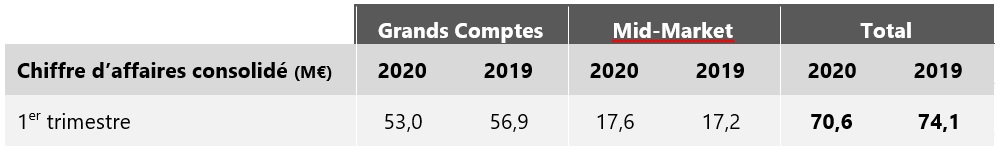 Le Groupe Keyrus a enregistré un chiffre d’affaires de 70,6 millions d’euros au premier trimestre 2020, en baisse de 4,7% par rapport au premier trimestre 2019. A périmètre et taux de change constants, la diminution s’élève à 5,5%, et concerne exclusivement le segment Grands Comptes. Cette baisse de chiffre d’affaires s’explique principalement par un ralentissement des activités en Europe et en Amérique du Sud, auquel s’ajoute un fort impact du taux de change au Brésil. Les activités Grands Comptes sont en retrait de 6,8% par rapport au premier trimestre 2019 (-7,8% à périmètre et taux de change constants). Si le ralentissement perdure sur le marché français ainsi qu’en Europe et au Brésil, la dynamique est forte sur le reste des géographies du Groupe, et plus particulièrement en Amérique du Nord. Le chiffre d’affaires des activités Mid-Market s’élève à 17,6 millions d’euros, en hausse de 2,3% par rapport au premier trimestre 2019. Ces activités restaient bien orientées pour l’exercice 2020 jusqu’à la période de confinement, avec une prise de commandes en croissance de 27% sur les 10 premières semaines. Pour la suite de l’exercice, Eric Cohen, Président-Directeur Général, commente : « L’exercice 2020 sera un exercice exceptionnel lié à la crise du Covid-19 et viendra tester fortement la résilience des entreprises. Même si le retour à un niveau d’activité pré-crise prendra du temps, les entreprises font aujourd’hui face à des enjeux d’économie post-crise qui nécessiteront des investissements en matière de Data Intelligence, de Digitalisation des processus, de Migration Cloud et d’accélération de la prise de décision. Nous sommes parfaitement positionnés pour conseiller nos clients sur l’adaptation de leur plan stratégique de transformation digitale à cette nouvelle donne et les accompagner sur ces projets, d’autant que le télétravail, devenant une nouvelle norme, reste particulièrement bien adapté à notre secteur d’activité. Nous considérons, au regard de notre performance du premier trimestre et en tenant compte de prévisions à ce jour, que la poursuite de notre exploitation n’est pas remise en cause.»