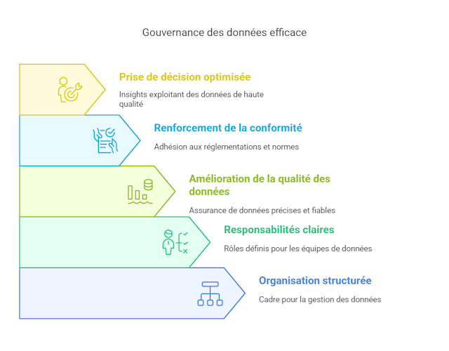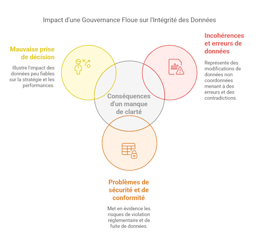 Incohérences et erreurs dans les données : sans règles claires, différents services peuvent modifier les mêmes données sans coordination, engendrant des erreurs et des contradictions.
