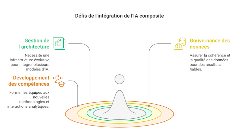 Si l’IA composite apporte une valeur stratégique, sa mise en œuvre implique des défis techniques et organisationnels :
