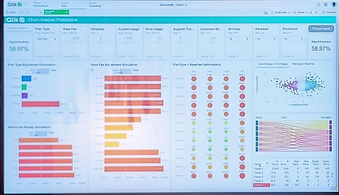 AutoML : à partir de données d'entraînement (« variables ») une cible est choisie, Qlik définit le modèle le plus équilibré (« le f score le plus élevé »), affiche l'impact des variables sur la cible. Ce modèle peut être customisé puis déployé. La démonstration est faite sur la probabilité de résiliation de contrat de client : Qlik permet de classer les clients par risque de résiliation.