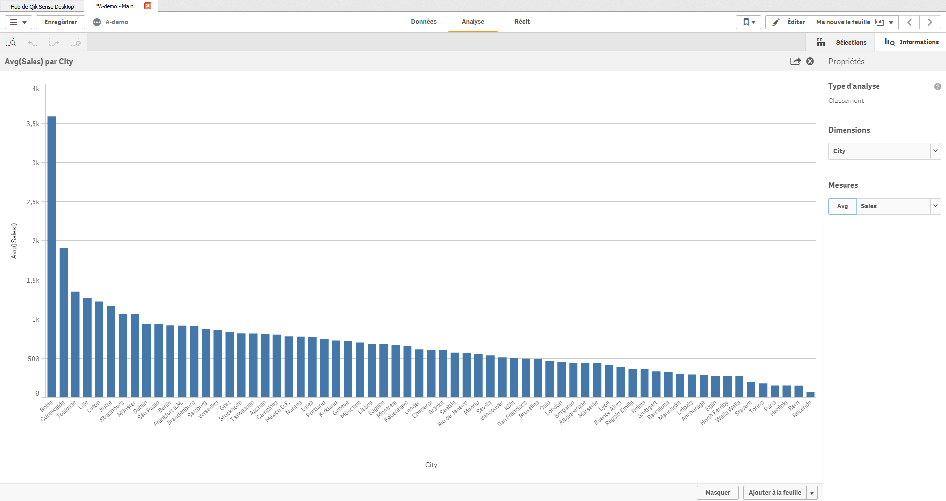 Suis-je obligé d‘effacer ma recherche et de réécrire ce que je veux ? Non, toute la puissance de Qlik est disponible lors de la création de graphiques, ce qui veut dire que l’utilisateur peut filtrer chaque proposition ou modifier son contenu. J’ai par exemple la somme de mes ventes par mois dans un graphique en barres, je peux modifier les graphiques et remplacer la somme des ventes par la moyenne des ventes ou encore ajouter cette mesure.