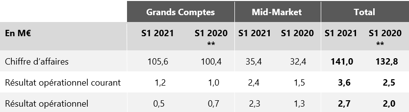 Le segment Mid-Market, grâce à la récurrence et à la robustesse de son business model, s’était montré très résilient en 2020. La croissance du carnet de commandes permet d’envisager un second semestre solide en termes de rentabilité. Le segment prouve également sa capacité à absorber des variations d’activité significatives, mais la faible visibilité sur le marché des PME et ETI françaises incite tout de même à rester prudent sur cette dynamique à long terme.