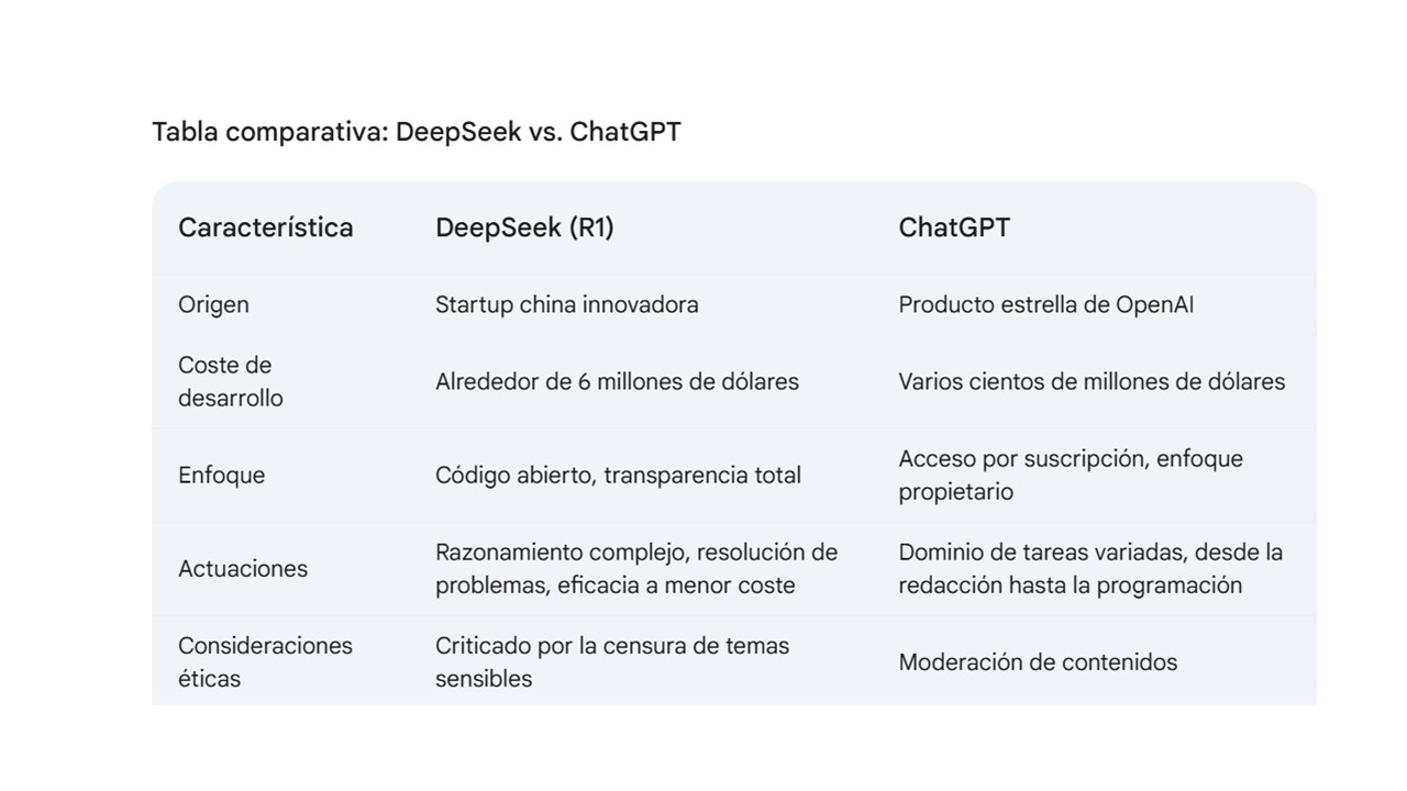 ChatGPT, el buque insignia de OpenAI, es el resultado de la suma de unas inversiones colosales más una investigación exhaustiva que a finales de 2022 revolucionó el mundo de la IA. Por el contrario, DeepSeek, una startup china fundada en 2023 por el empresario Liang Wenfeng, ha adoptado un enfoque más eficiente en términos de recursos y el pasado 20 de enero reveló su modelo R1, que rivaliza con los modelos de OpenAI lanzados hasta ahora, en términos de capacidades de razonamiento y, además, a un costo significativamente menor. Este enfoque ha permitido a DeepSeek ofrecer una alternativa a ChatGPT de alto rendimiento.