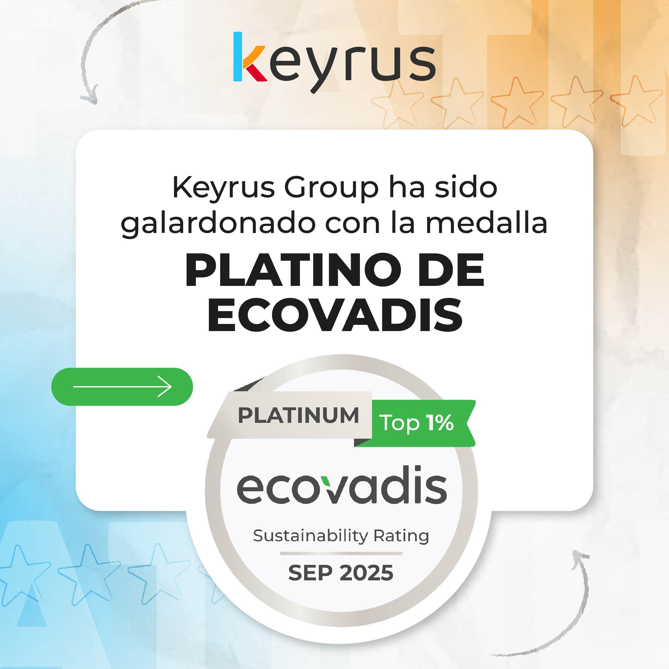 Un éxito colectivo La obtención de esta medalla ha sido posible gracias al esfuerzo conjunto de todos los equipos de Keyrus alrededor del mundo. Su compromiso diario con las mejores prácticas de sostenibilidad y RSE ha sido clave para alcanzar este reconocimiento internacional. Agradecemos cálidamente a todos nuestros equipos por su participación y reafirmamos nuestra determinación de continuar por este camino. En Keyrus creemos que la sostenibilidad y el rendimiento económico deben avanzar de la mano. La Medalla Platino de EcoVadis refuerza nuestra visión: hacer de la responsabilidad social una oportunidad para transformar y construir un futuro mejor.