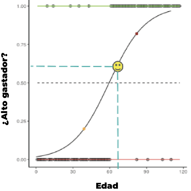 Nueva predicción para Jaime: tienes 66 en el eje X, lo mapearás hasta la línea en forma de S y lo cruzarás. Ahora, crees que hay un 60% de posibilidades de que Jaime sea un gran gastador. Utilizarás tu umbral, que está indicado por la línea negra de puntos en el gráfico anterior, para decidir si quieres predecir que es un gran gastador o no.