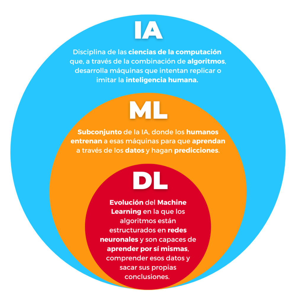 Y, por último, tenemos el Deep Learning, otro tema candente, un subconjunto del aprendizaje automático que ha sido en gran parte el responsable del auge de la IA de los últimos años. En pocas palabras, el aprendizaje profundo es un tipo avanzado de ML que utiliza redes neuronales artificiales con muchas capas interconectadas para aprender a partir de datos. En lugar de requerir que los ingenieros de datos seleccionen y diseñen manualmente las características relevantes, las redes neuronales profundas pueden aprender automáticamente características jerárquicas y complejas a partir de los datos de entrada. Por ejemplo, los algoritmos de Deep Learning se utilizan en el procesamiento del lenguaje natural para comprender el lenguaje humano y realizar tareas como la traducción automática. En la siguiente imagen lo tienes todo sintetizado.