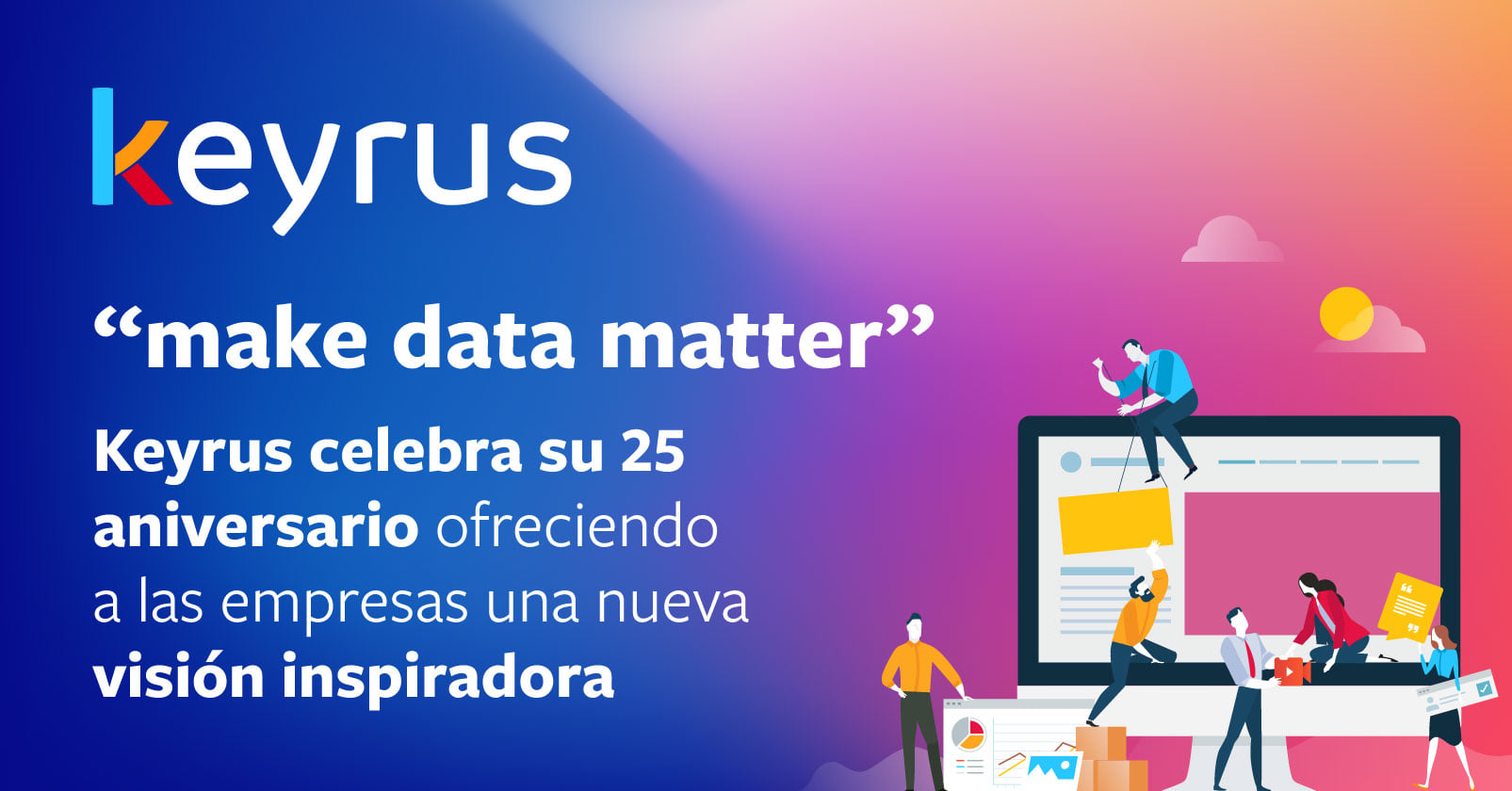Esta promesa se basa en tres creencias clave que tenemos sobre los desafíos actuales de nuestro mundo: “HUMAN DATA”: esta primera creencia afirma que los datos contienen las respuestas a los mayores retos a los que se enfrentan tanto las empresas como la humanidad en su conjunto. Nos enseña cosas sobre la manera en que nos comportamos y cómo el mundo cambia, toma forma y mejora con el tiempo. “INSPIRATIONAL REALITY”: Esta creencia subraya uno de nuestros principios clave: inspirar siendo pragmáticos y basados en la realidad. Se basa en nuestra capacidad para ofrecer soluciones que no solo sean eficaces y que se puedan utilizar inmediatamente, sino que también incorporen una innovación continua, lo que supone una fuente esencial de progreso y reinvención para las empresas. “SIMPLEX FUTURE”: esta tercera creencia se refiere a la creciente complejidad de nuestro entorno. Atrapados en el torbellino de la explosión digital, la hiperconectividad y la inteligencia artificial, las empresas deben confiar en un socio que esté bien informado y sea perspicaz. En este contexto, Keyrus ayuda a sus clientes a adquirir capacidades y habilidades de comunicación y de toma de decisiones, esenciales para trabajar de forma clara y directa hacia sus metas. Estas creencias forman el marco de trabajo de la nueva era en la que el Grupo Keyrus se está embarcando con entusiasmo y pasión. Revelan nuestras nuevas áreas de reflexión y anticipación, siempre impulsadas por una cultura de emprendimiento e innovación. Nuestro nuevo eslogan, “make data matter”, transmite el significado y el valor de nuestro trabajo. En Keyrus los datos son parte de nuestro ADN. Día tras día, ponemos el Data Science a trabajar en la búsqueda de soluciones para los desafíos estratégicos de nuestra era. Dado que los datos se originan en las actividades humanas, este eslogan también sirve como recordatorio de lo importantes que son las personas en el capital de nuestras empresas, y de lo esencial que es para cada player económico trabajar hacia una mayor sostenibilidad a través de las soluciones y servicios que ofrecen.