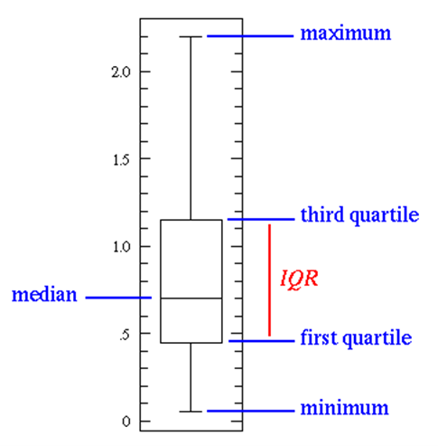 Los rasgos estadísticos (un concepto básicoenel Data Science) entran en juego durante la fase de exploración de datos e incluyen temas como el sesgo, la varianza, la media, la mediana y los percentiles. Al observar el gráfico que aparece a continuación, los valores mínimo y máximo representan los extremos superior e inferior del rango de datos.