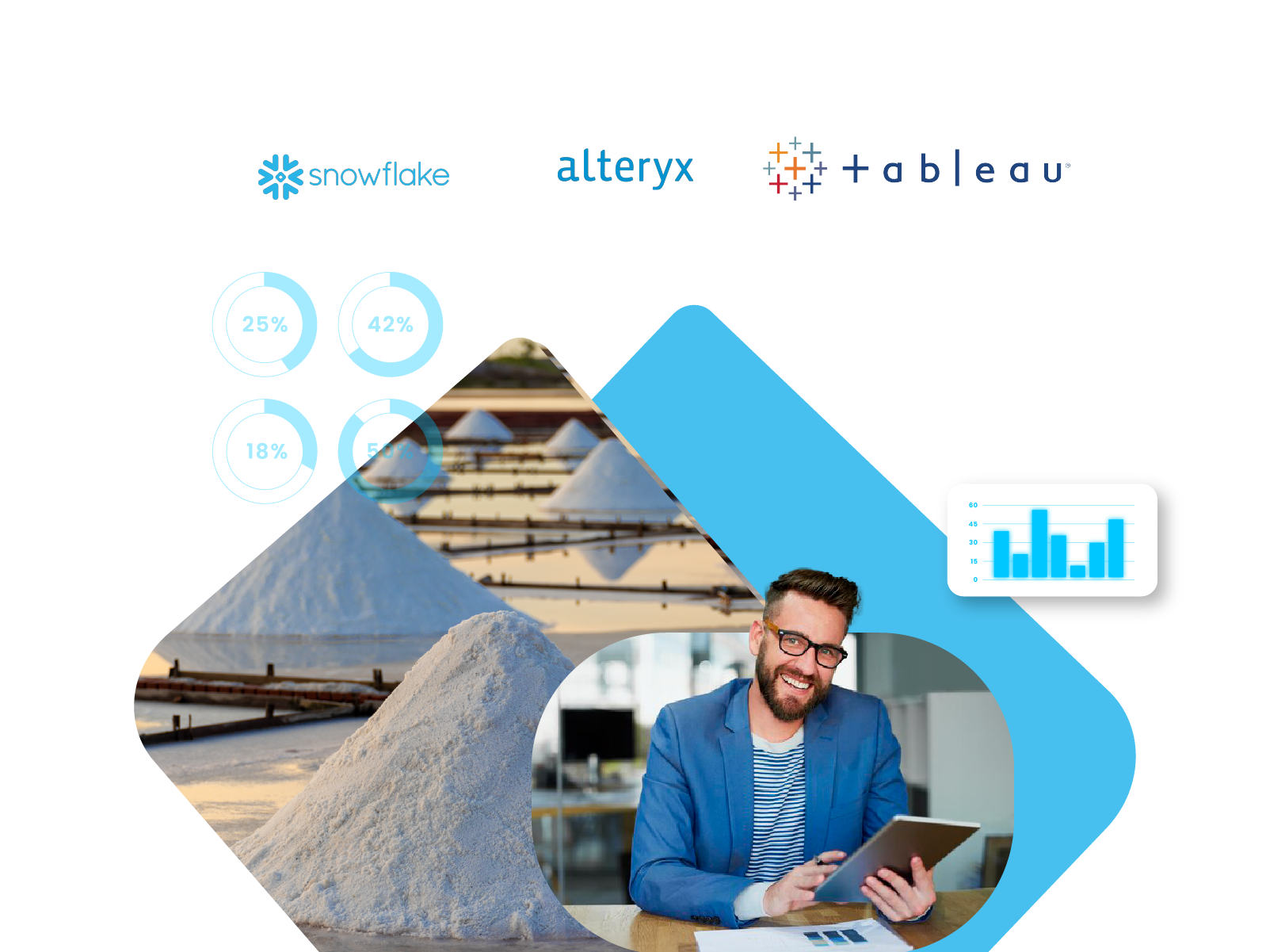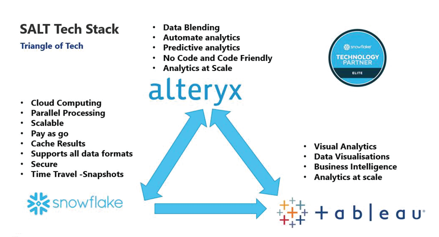 The SALT stack (Snowflake, Alteryx & Tableau) is a seamless, modern, analytics combination of technologies. It allows any organization to combinate them for a given use case and allowing them to go from linear technology to a flexible & scalable one.