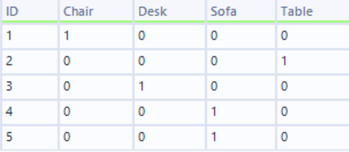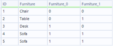 One-Hot Encoding takes a single categorical column and creates a separate binary column for each of the variables contained within. This works best with nominal data when categories have no identifiable order. However, when you have a large number of unique categorical variables, you will need to be careful using this technique as it could lead to a high dimensional representation, making the data more sparse and, therefore, more difficult to find patterns. This could lead to poor generalizations and risks of overfitting. The below example shows how the column ‘Furniture’ is split into binary columns for each individual item.