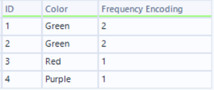 Frequency Encoding assigns a value based on a count of a category’s occurrence in the data set. This technique should be used with caution, especially when the frequency of the categories is imbalanced. However, this can be resolved by normalizing the values after encoding. The below example shows the encoded frequency based on a color column.