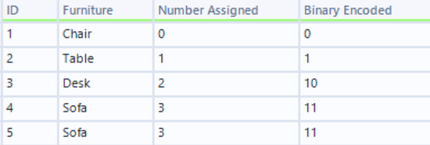 Binary Encoding assigns a binary number to each category. This is similar to One-Hot Encoding but can be more efficient by generating fewer features. As with One-Hot Encoding, this works best for nominal data. For the below example, we’ll look at our furniture column from One-Hot Encoding again.