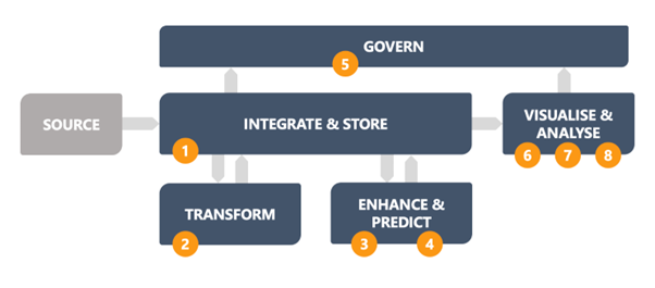 Whilst there is no one-size-fits-all modern data stack, we can typically summarise it as shown in the diagram below. Of course there are multiple possible variations of this, with tools that sit between these elements and some that span multiple elements.