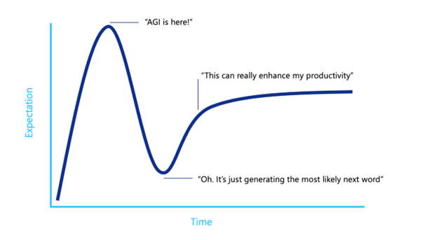 Time and again this chart has been applied to new innovations and it arguably applies well to the journey so far with Large Language Models. Many of us were shocked by what it could achieve in the early days. The responses from ChatGPT appeared so intelligent that it was natural to assume AGI (Artificial General Intelligence) was just around the corner (it may still be!).