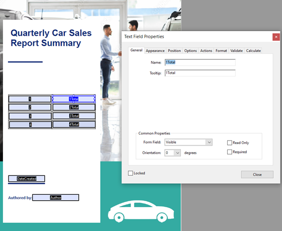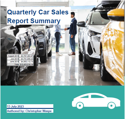 The next process will explore using the Python tool and a prepared PDF document. There are many unique methods when creating outputs with Python. The method we are using minimizes the need for code and takes advantage of the Alteryx tools we have available. Our PDF has been prepared, providing annotations for all the components which need to be filled, for example, our summary table of car sales for the quarter.