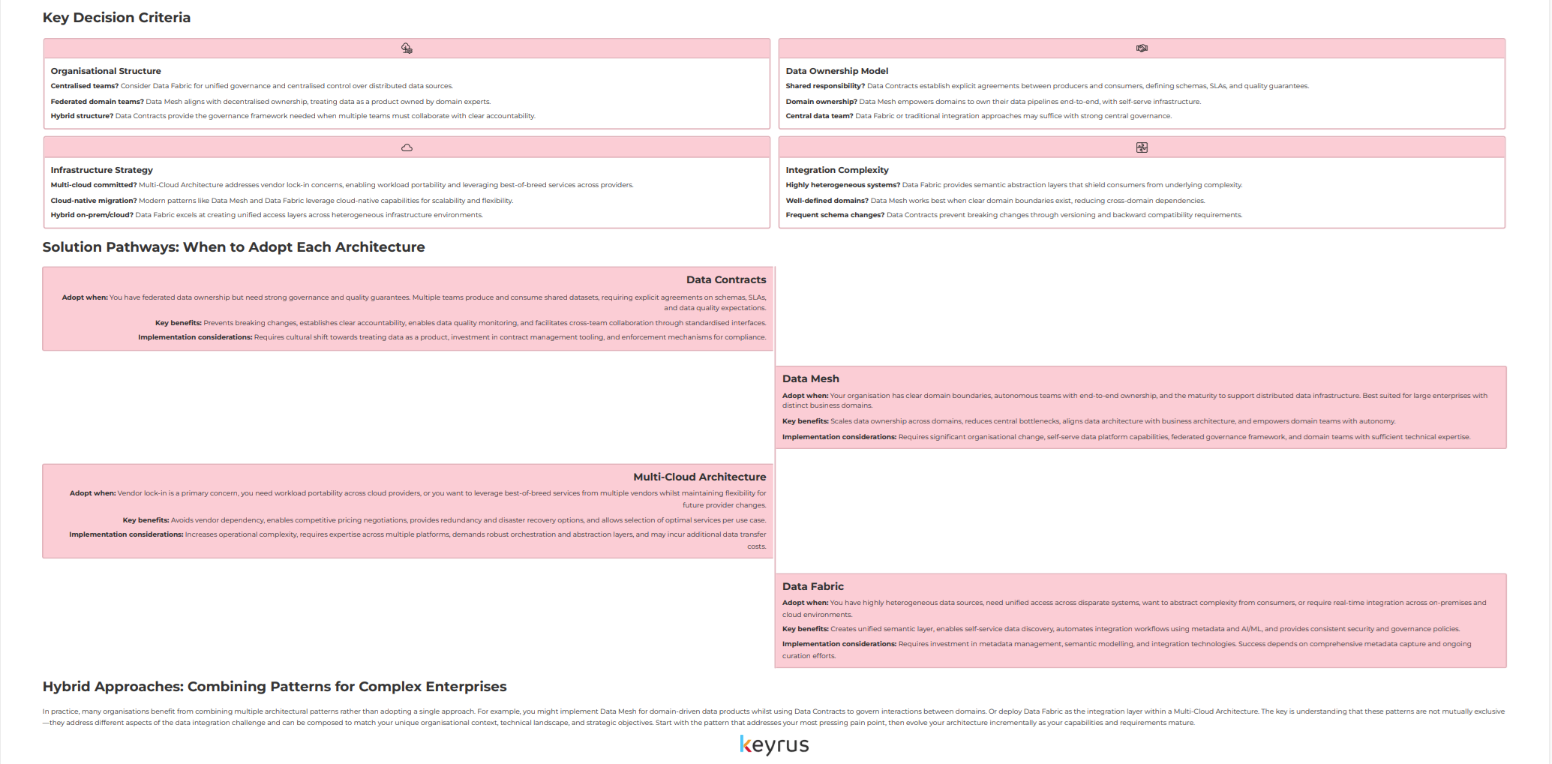 Weeks 3-4: Define your target state architecture. Choose between data fabric, data mesh, or hybrid approaches based on your organisational structure and use cases.