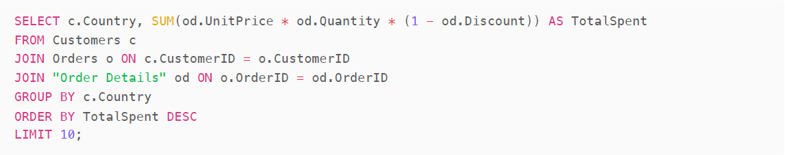 Using GPT 4o, the Order Details table is also included and the LLM correctly defines a TotalSpent value by taking into account the unit price, quantity and even discount applied. It also makes use of table aliases for improved readability (which 3.5 Turbo did not do). The Top 10 countries are returned by the query and included in the answer. This wasn't requested but is arguably useful information.