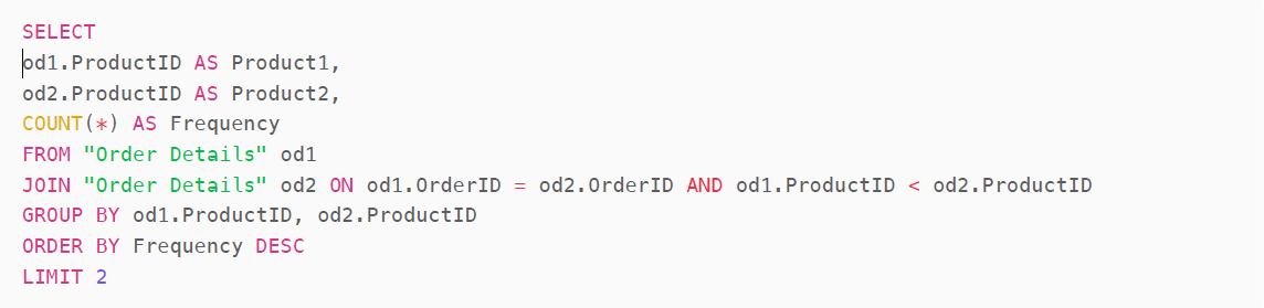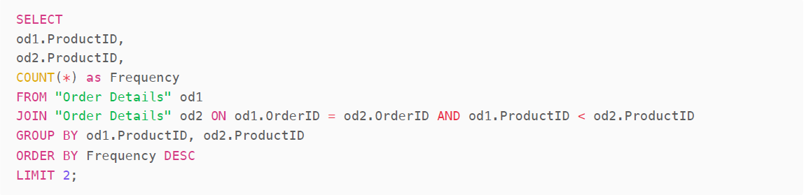 "The two products that are most frequently bought together are ProductID 20 and ProductID 66, with a frequency of 5445 times. The next most frequently bought together are ProductID 22 and ProductID 66, with a frequency of 5442 times."