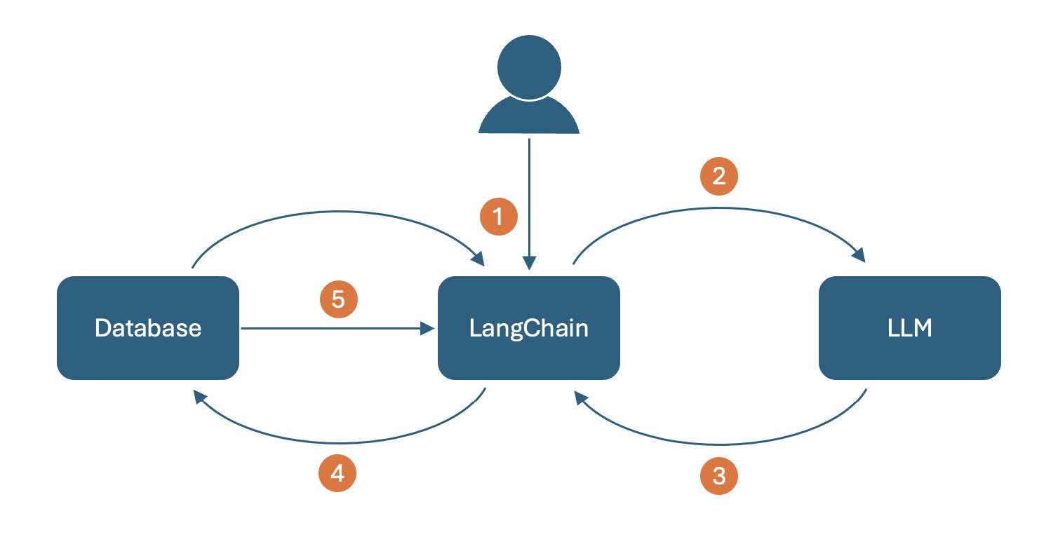 1. LangChain collects the User's question and the database schema information (table and column names) 2. The information is fed to a LLM, along with a written command to create a SQL query 3. The LLM generates a SQL query and responds 4. LangChain connects to the database and executes the query 5. The database returns a result