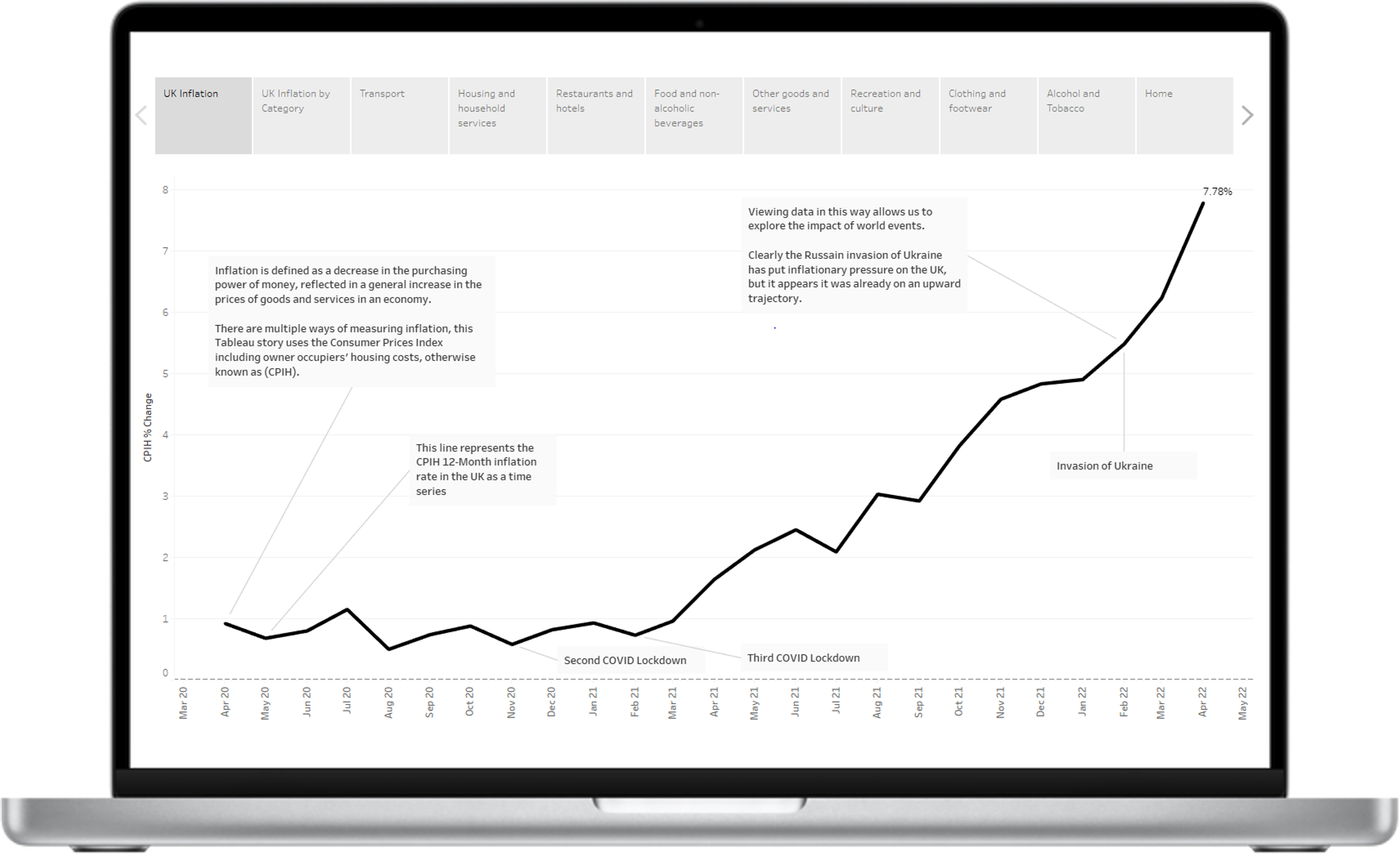 In this example, a story has been used to breakdown the complexity of price inflation by building up to the macro view in small steps. Providing a more intuitive "story" to the user allows them to engage with what it is you are trying to convey.