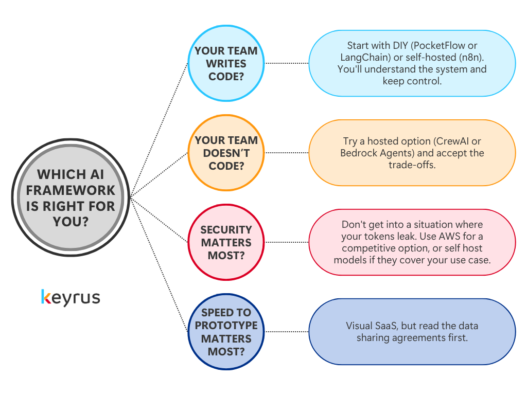 - Your team doesn't code? Try a hosted option (CrewAI or Bedrock Agents) and accept the trade-offs.