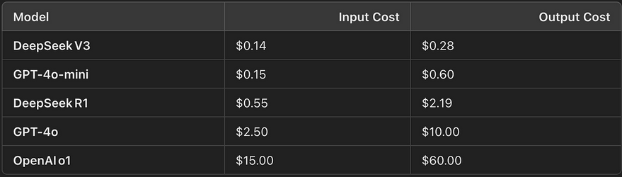 Even lightweight versions like DeepSeek V3 outperform their counterparts in terms of cost-effectiveness, with input costs of$0.14and output costs of $0.28, far outperforming GPT-4-mini while maintaining competitive performance.