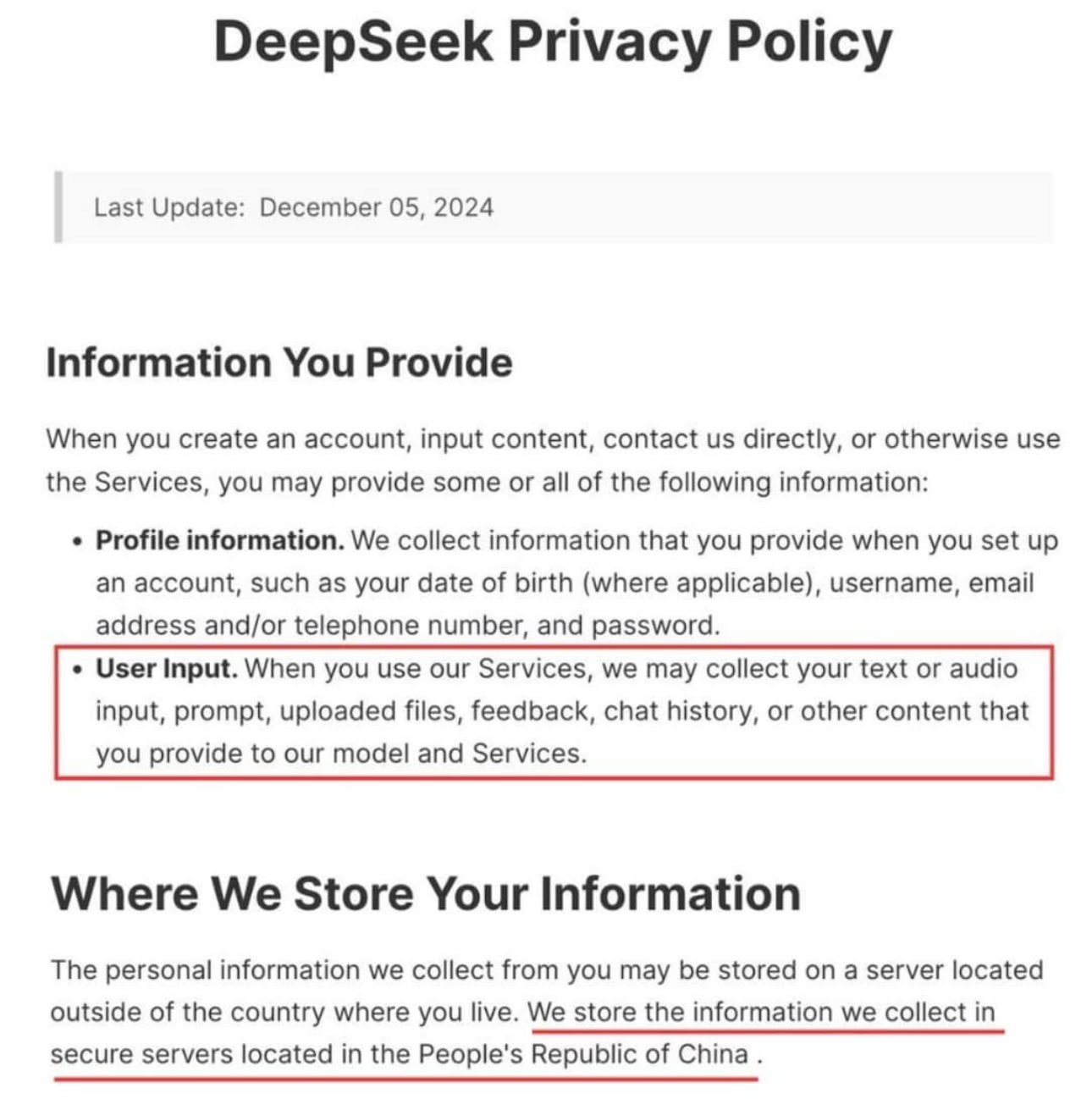 DeepSeek's privacy policy raises concerns, particularly regarding the collection of sensitive data (profile, interaction history) stored on servers in China, subject to strict local laws. Unlike ChatGPT, which offers options such as incognito mode, DeepSeek lacks transparency on data retention and use, which may hamper its adoption, particularly in Europe.