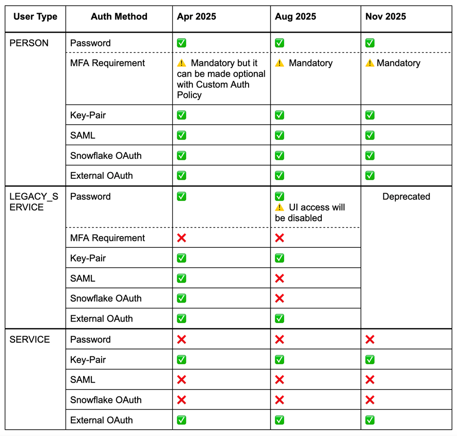 LEGACY_SERVICE users will also lose access to Snowsight in August 2025. If you rely on password-based automation, ETL jobs, or integrations, you’ll need to start planning a migration strategy now to avoid disruptions.