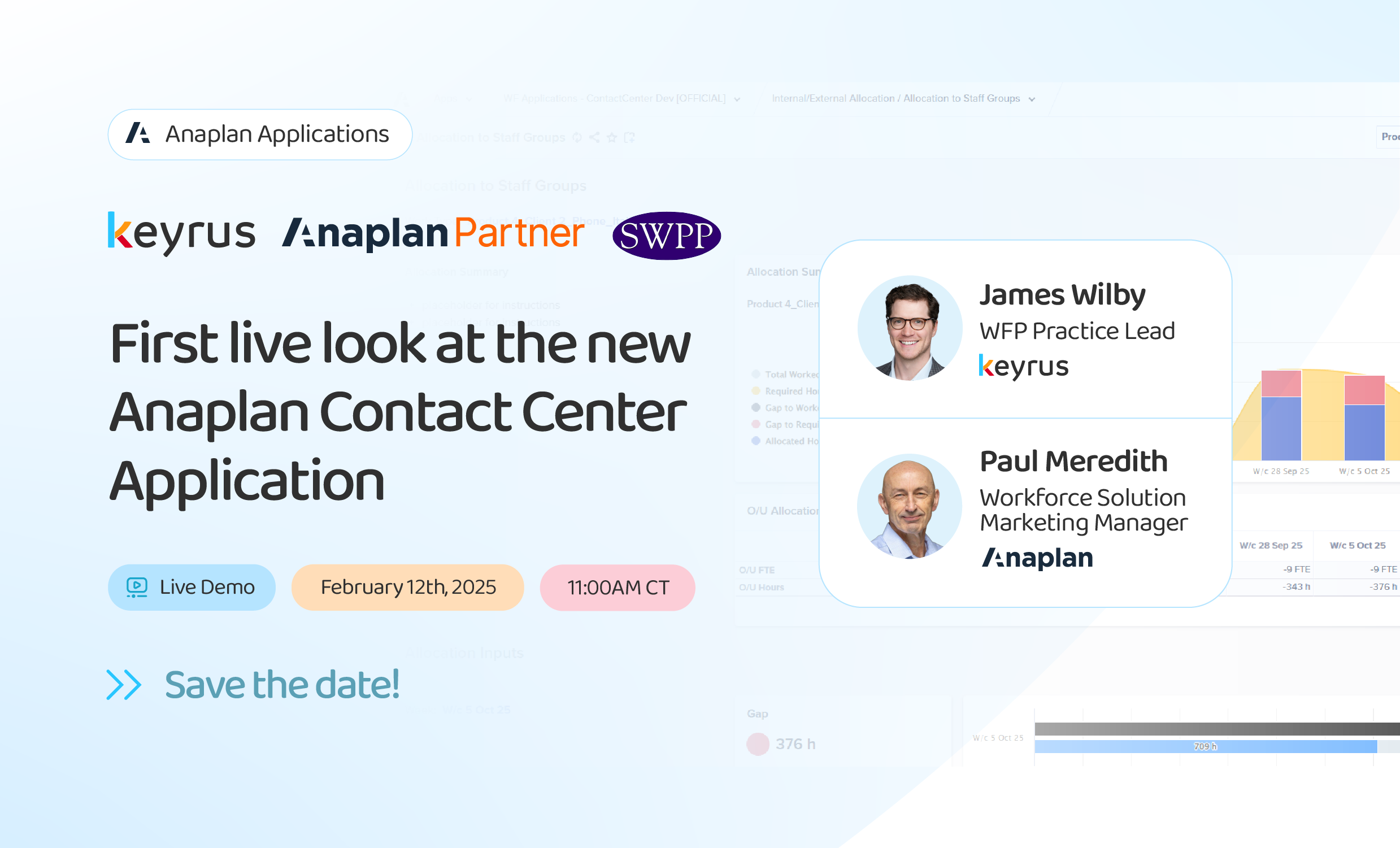 On February 12, the Society of Workforce Planning Professionals (SWPP), Keyrus, and Anaplan will cohost an exclusive live webinar showcasing the new Anaplan Contact Center Planning application โ a next generation, AI-enabled solution that unifies forecasting, capacity modeling, financial workflows, and scenario planning in one governed platform.