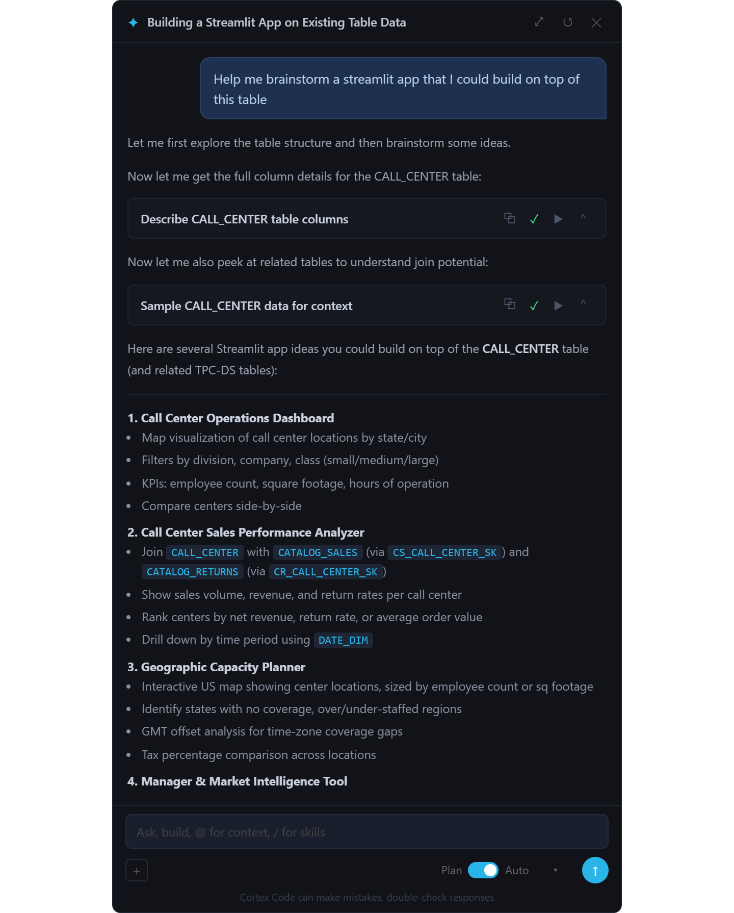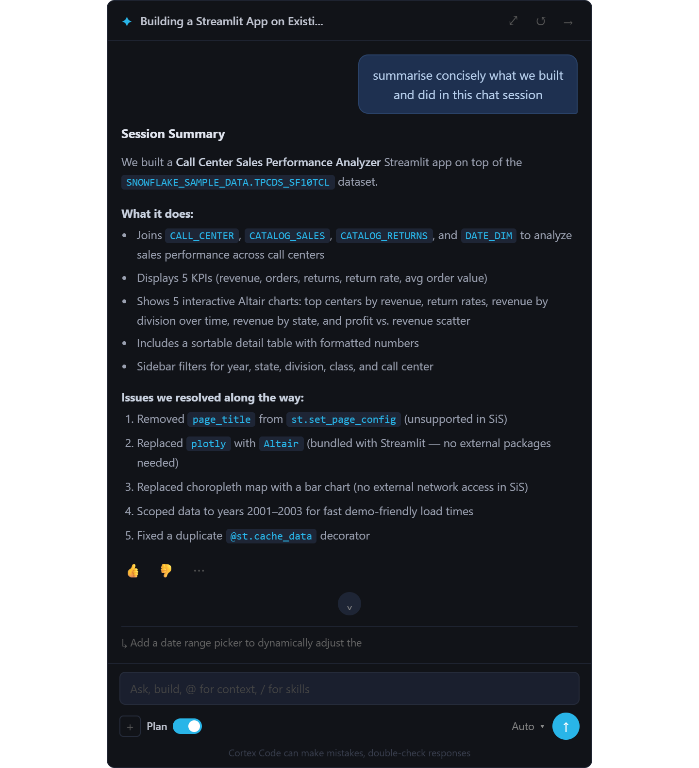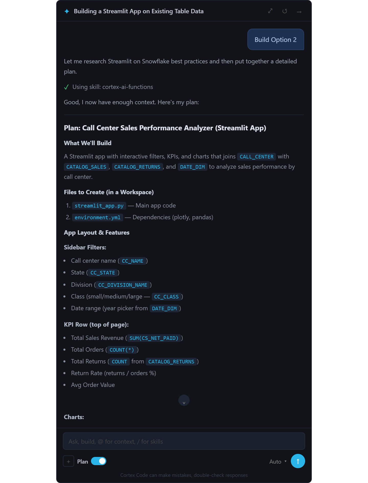 See Cortex Code in action across a real scenario - I've compiled a series of screenshots that walk through my deployment of a streamlit app that analyzes sales performance across call centers, a 20 minute build with Cortex Code.