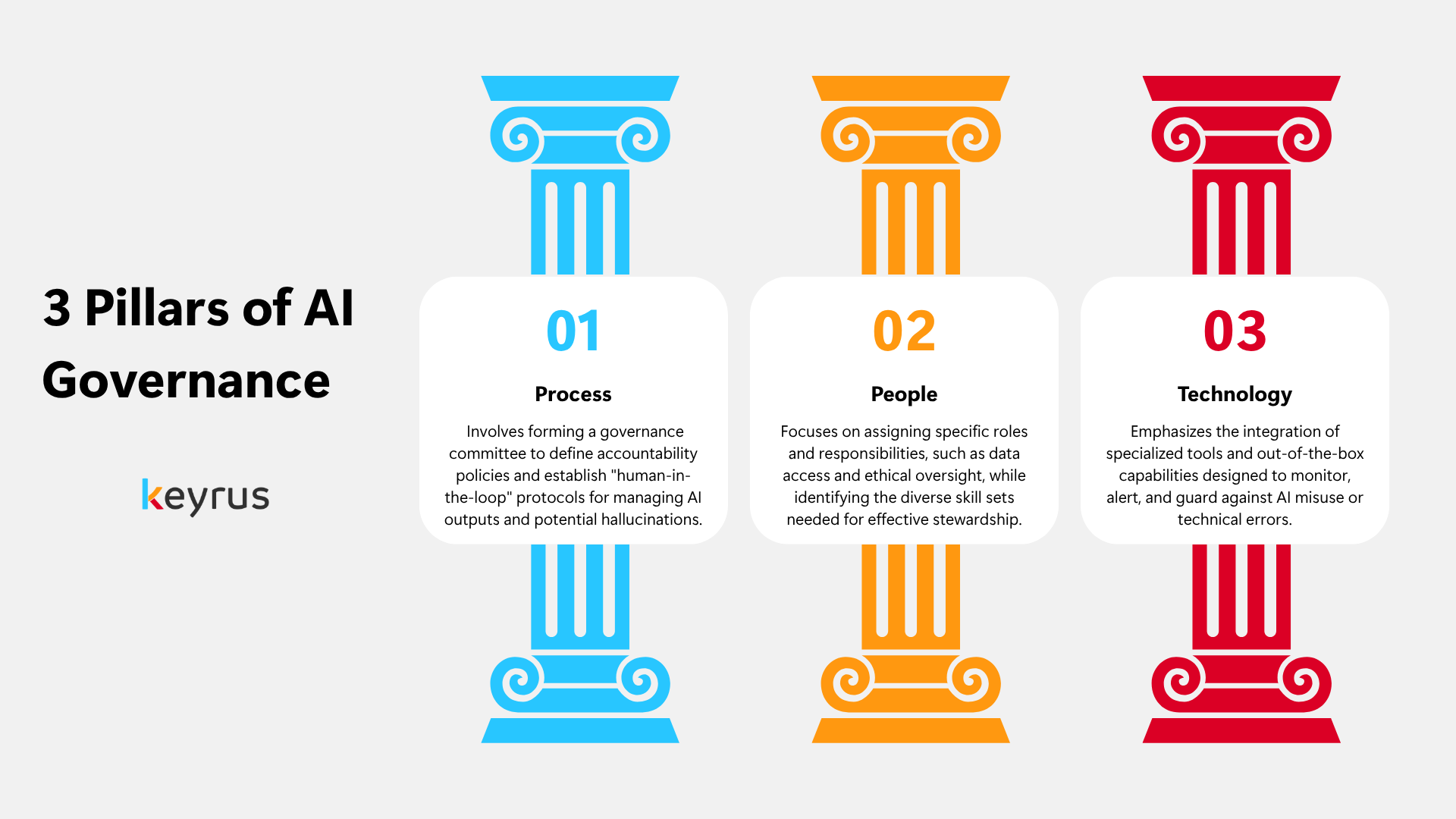 At Keyrus, we believe the three (3) pillars of AI Governance are Process, People, and Technology. These pillars serve as a solid foundation for building your own AI governance policies and rules.